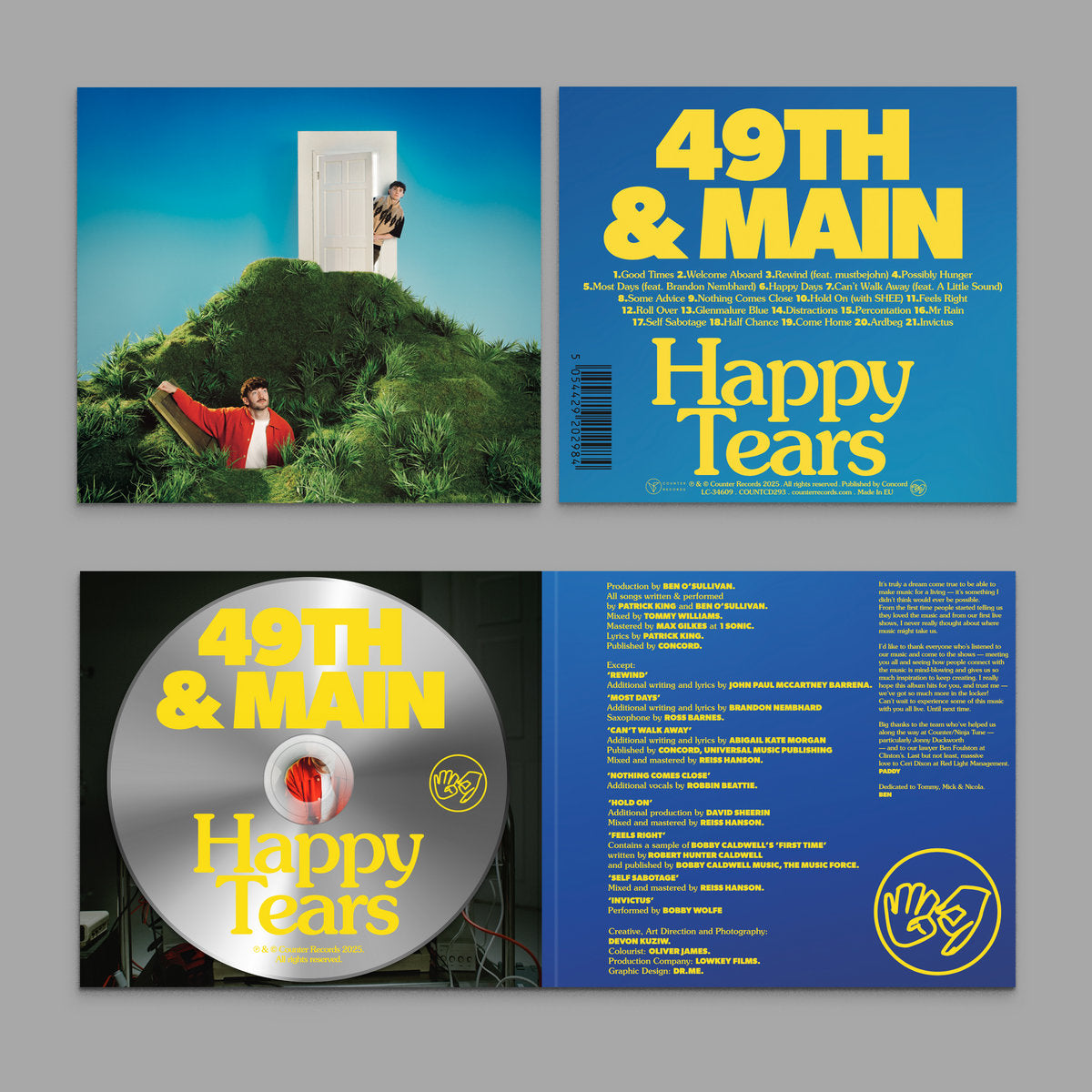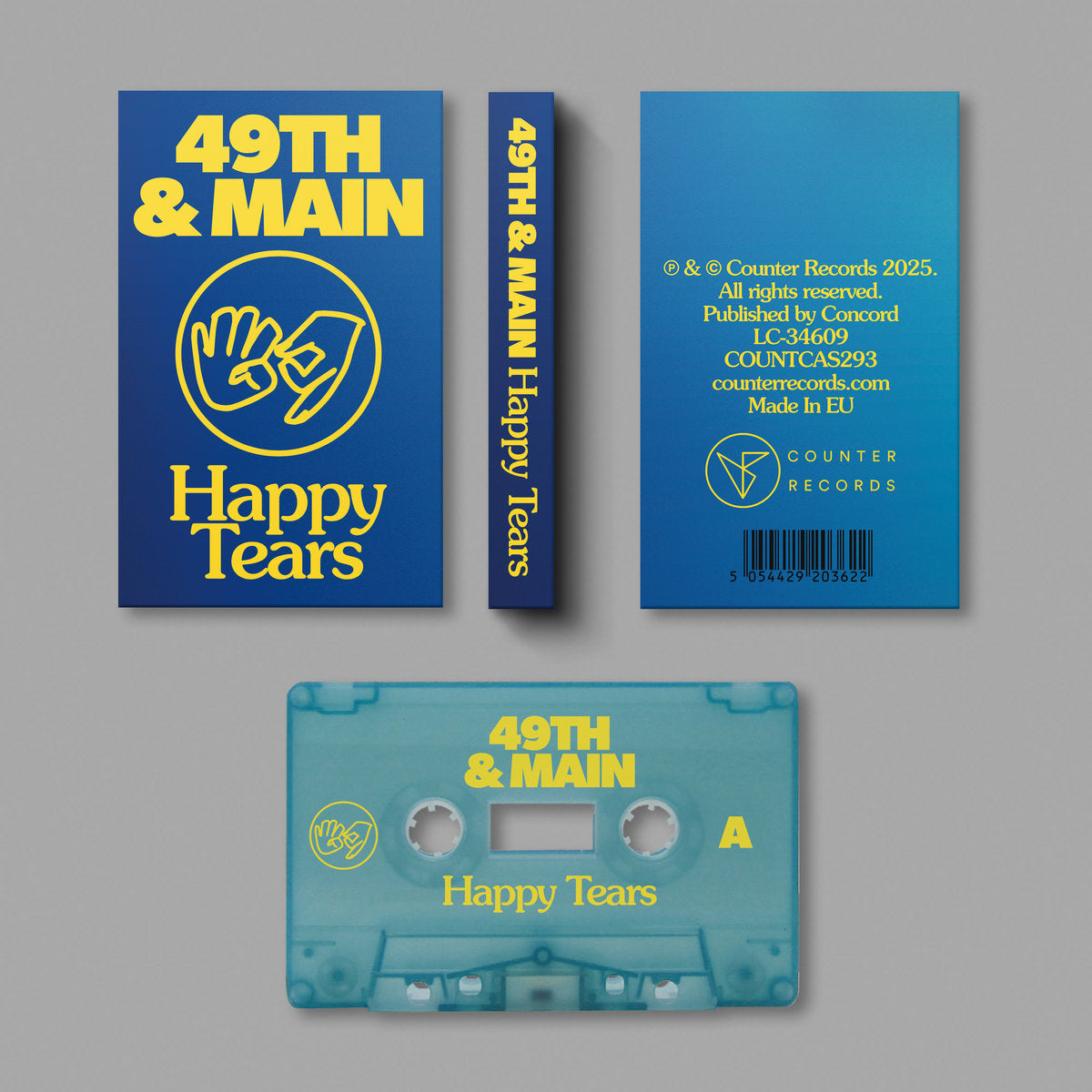 49th & Main’s debut album 'Happy Tears' pressed on limited 140g ‘Glenmalure Blue’ inkspot pattern vinyl (blue / white).